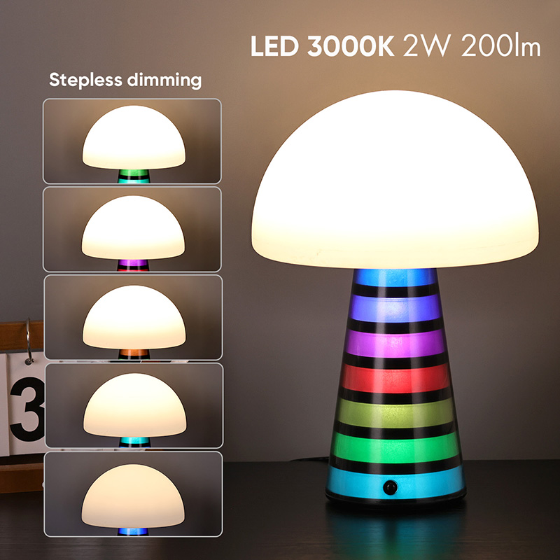 مشروم نیین مٹیل کلر ٹیبل لیمپیٹ خود کو بجلی فراہم کرنے کے لئے ایک ٹائپ سی پورٹ ہے ، 3000K- 6500K 2WATT 200LM میں شامل ٹائپ سی کیبل 1M , 5V1A محفوظ چارجنگ ہیڈ اور کیبلز اندر موجود ہیں۔
