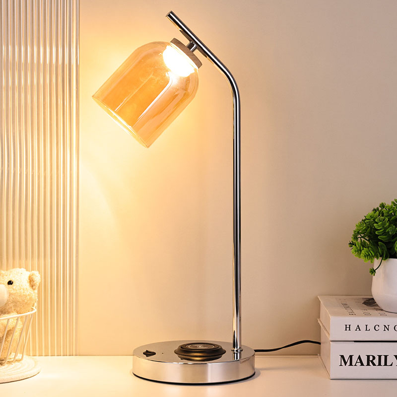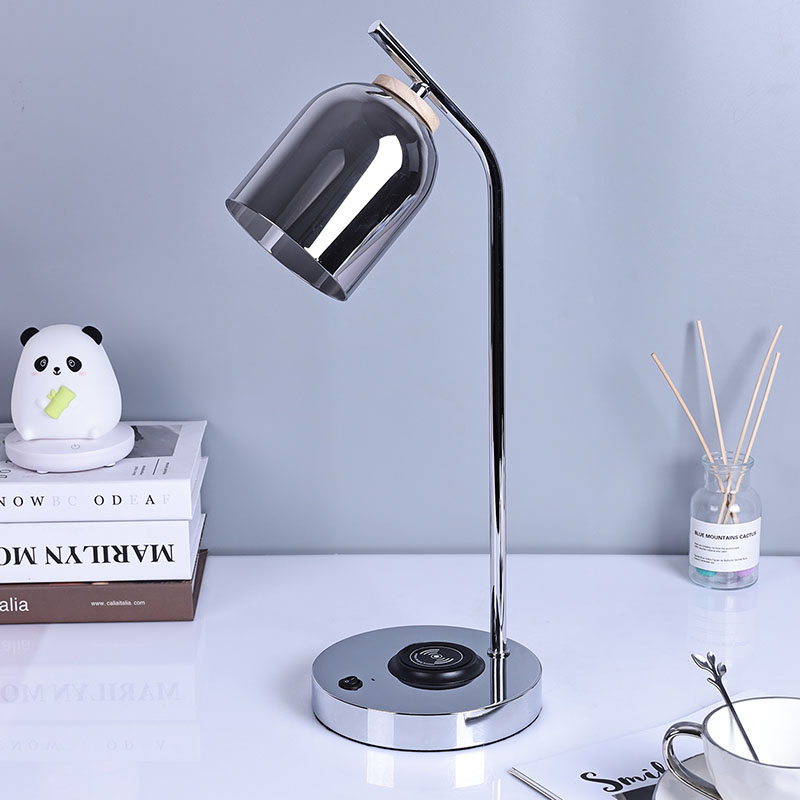شیشے کے سائے کے ساتھ کیوئ ایل ای ڈی ڈیسک لیمپ میں کیوئ وائرلیس سرٹیفکیٹ ہے۔ 5v1a وائرلیس فون چارجر بیس پر