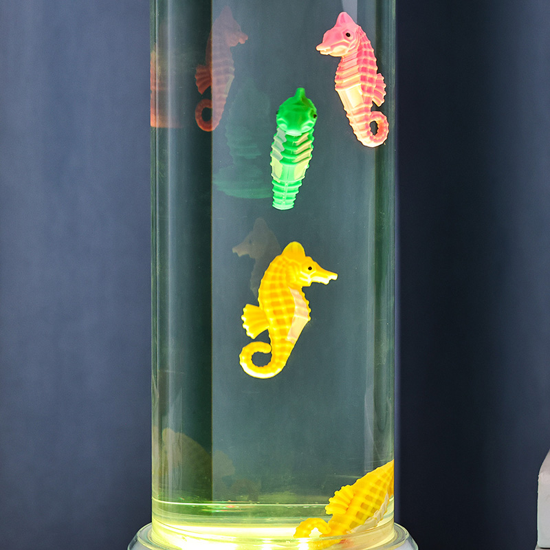 پانی کے اندر کا دلکش منظر جو سمندر کے سکون کو ابھارتا ہے پوری یونٹ اعلیٰ معیار کے پائیدار پلاسٹک سے بنائی گئی ہے جو حفاظتی استحکام اور دیرپا کارکردگی کو یقینی بناتی ہے لیمپ تقریباً 12 انچ لمبا ہے جس میں ایک چیکنا شفاف ٹیوب غیر زہریلے سیال سے بھری ہوئی ہے اور رنگین سمندری گھوڑوں کے زیورات کے ساتھ ہر ایک سمندری گھوڑے کو توجہ دینے کے لیے تیار ہے۔ رنگ اور حقیقت پسندانہ بناوٹ وہ مائع کالم میں خوبصورتی کے ساتھ تیرتے ہیں گردش کا نظام جو حقیقی سمندری زندگی سے مشابہ قدرتی لہراتی حرکت پیدا کرتا ہے یہ نرم حرکت دیکھنے میں سکون بخش ہے اور ایک پرسکون بصری تجربہ فراہم کرتے ہوئے تناؤ کو کم کرنے میں مدد کرتی ہے۔