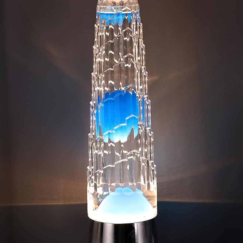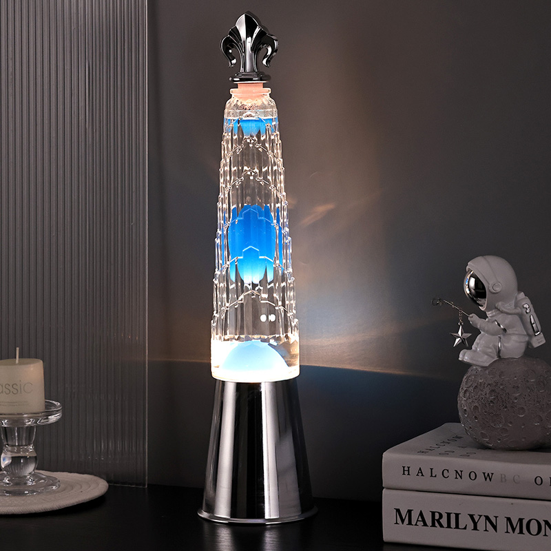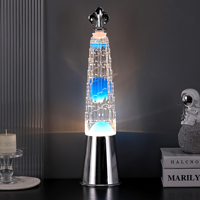 ٹاور شیڈ لاوا لیمپ ٹیبل لیمپ میں ایک کلاسک ٹاور کے سائز کا ڈیزائن شامل ہے ، جس میں سب سے اوپر ، آسان ابھی تک نوبل میں سرایت شدہ سیاہ دھات کی سجاوٹ کے ساتھ۔ شفاف شیشے کی بوتل کے اندر ، بلیو موم موجود ہے